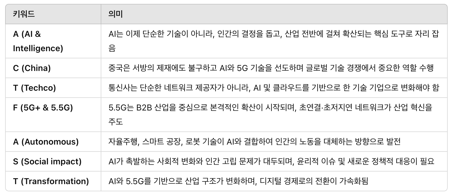 올해의 핵심 메시지는 AI가 인간의 능력을 확장하고, 5.5G가 산업의 핵심 인프라가 될 것이라는 점입니다.