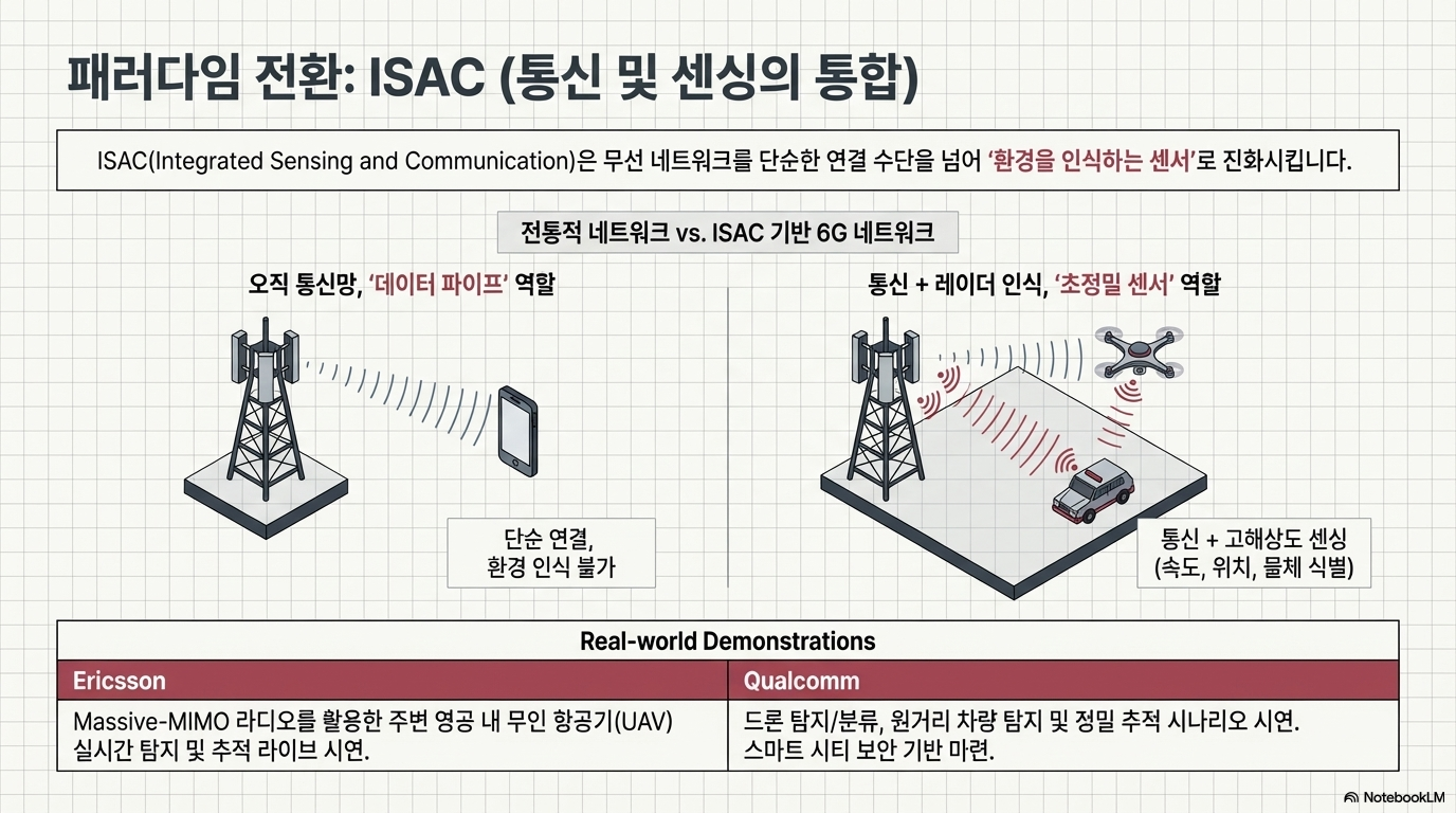 가장 혁신적인 지점은 ISAC(통합 감지 및 통신) 기술의 구현입니다. 이는 통신망이 데이터를 실시간 전송하는 동시에 주변 물리 환경을 레이더처럼 '감지'하는 능력을 갖추는 것입니다. Ericsson은 Massive-MIMO 라디오를 통해 별도의 센서 없이도 하늘 위의 드론을 추적하는 시연을 성공시키며, 스마트 시티의 새로운 지평을 열었습니다.
