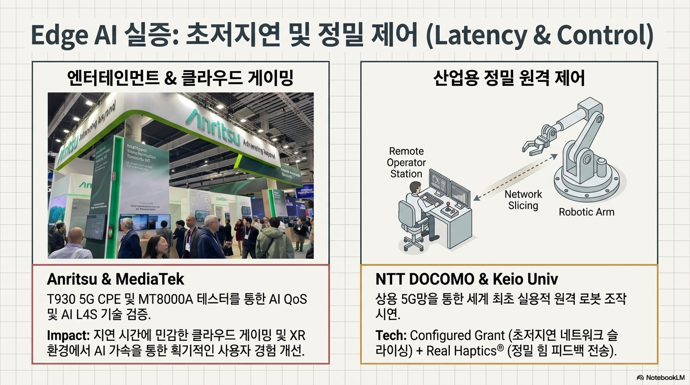 이와 함께 MediaTek과 Anritsu는 MediaTek T930 5G CPE 플랫폼을 통해 AI 기반의 QoS(서비스 품질) 및 L4S 기술을 검증했습니다. 이 지능형 CPE는 클라우드 게이밍이나 XR 환경에서 발생하는 지연 시간을 실시간으로 보정하여 사용자에게 끊김 없는 몰입감을 제공합니다. 이러한 초저지연 기술의 완성은 원격 의료 로봇, 라이브 커머스, 고난도 산업 자동화 시장을 재편하는 기폭제가 될 것입니다.