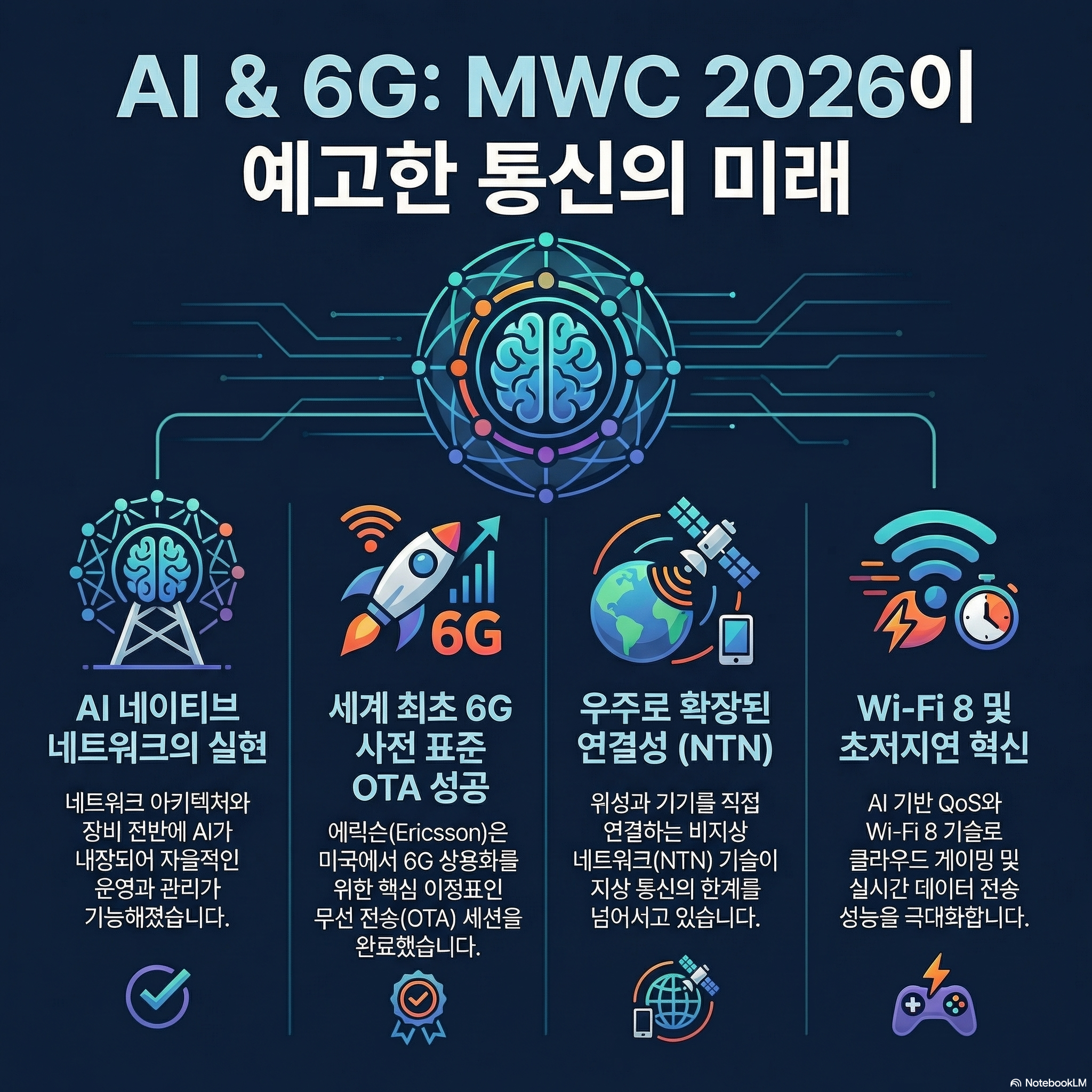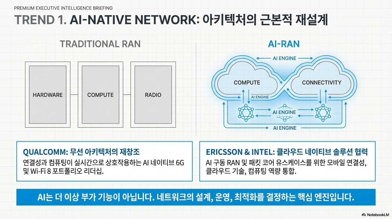 이번 MWC의 핵심은 AI가 통신의 부가 기능이 아닌, 설계(Architecture) 단계부터 핵심 DNA로 자리 잡은 'AI-Native'로의 전환입니다. 이는 단순한 운영 보조를 넘어, 네트워크 스스로가 상황을 인지하고 최적화하는 자율 주행형 인프라의 시대가 왔음을 의미합니다.