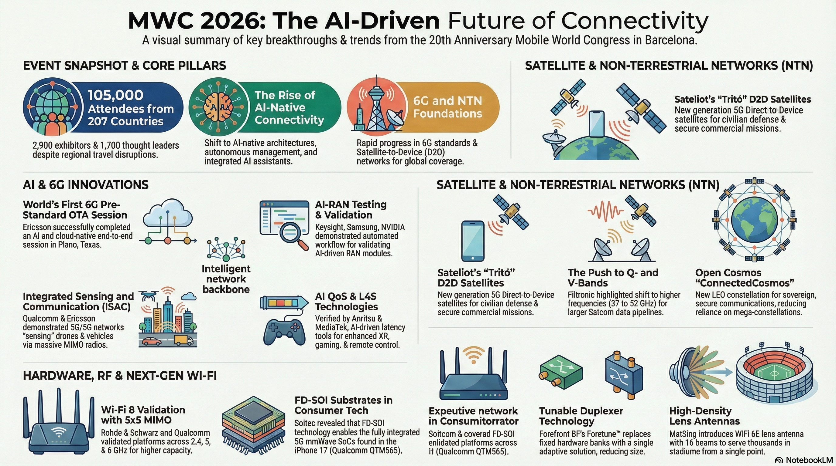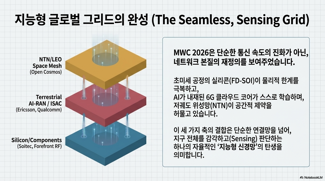 MWC 2026이 우리에게 던진 메시지는 명확합니다. 이제 네트워크는 단순히 데이터를 나르는 '파이프'가 아닙니다. 스스로 생각하는 AI-Native 아키텍처, 물리적 세계를 느끼는 ISAC 감지 능력, 그리고 전 지구를 주권적으로 잇는 위성망이 결합된 하나의 거대한 '지능형 플랫폼'입니다.
