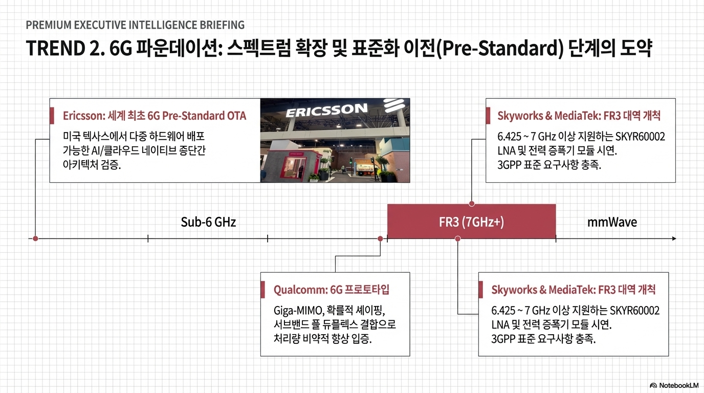 6G는 이제 속도 경쟁을 넘어, 네트워크를 하나의 거대한 '생물학적 신경계'처럼 만드는 과정에 진입했습니다. Ericsson은 세계 최초의 6G 프리-스탠다드(Pre-standard) OTA(Over-the-Air) 세션 성공을 발표하며, 6G가 단순한 기술 표준이 아닌 '국가 안보와 경제 경쟁력'의 핵심 인프라임을 명확히 했습니다.