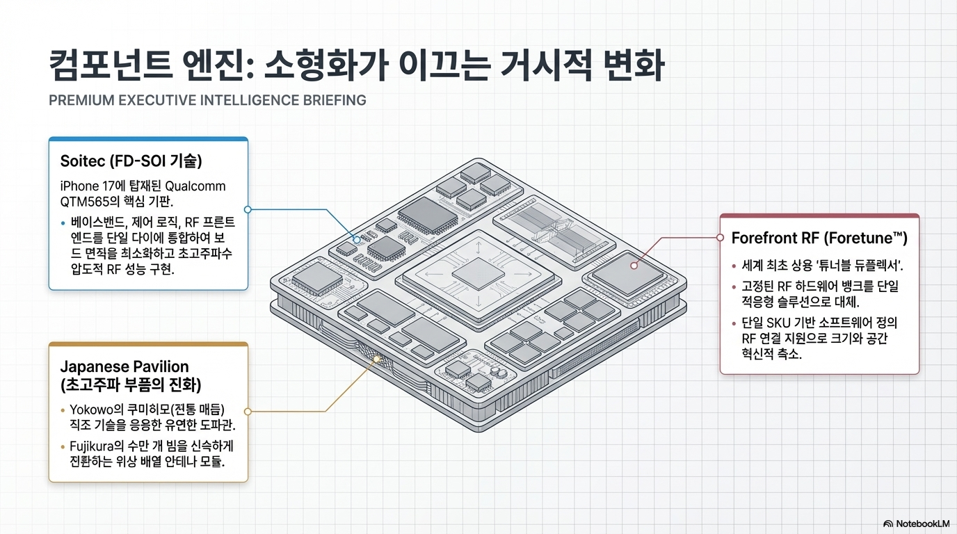 눈에 보이지 않는 인프라의 진화 뒤에는 반도체 소자의 파괴적 혁신이 뒷받침되고 있었습니다. Soitec은 차세대 iPhone 17에 탑재될 Qualcomm QTM565의 핵심 토대인 FD-SOI(완전 공핍형 실리콘 온 인슐레이터) 기술을 공개했습니다. 이 기술은 베이스밴드, 제어 로직, RF 프런트엔드를 단일 칩(SoC)에 통합하여 기기의 크기를 줄이는 것은 물론, 극적인 배터리 효율과 RF 성능 향상을 실현했습니다.