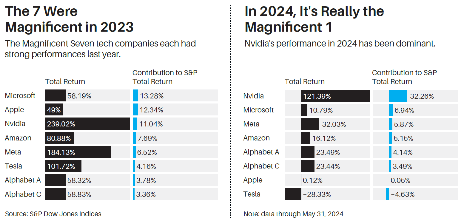 그러나 올해는 이야기가 다릅니다. NVIDIA의 시장 지배력이 더욱 두드러졌습니다. 2024년 5월 31일까지 NVIDIA는 S&P 500 지수의 총 수익률 중 32.26%를 차지했으며, 나머지 여섯 개 주식의 기여도를 훨씬 뛰어넘었습니다.