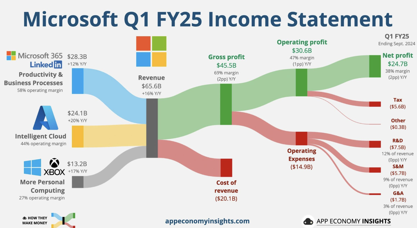 Microsoft의 FY25 Q1 매출은 656억 달러로 전년 대비 16% 증가했습니다. 이 매출 증가는 예상을 뛰어넘는 실적이었으며, 10억 달러 이상의 매출 예측치 초과를 기록했습니다. 주목할 만한 점은 이 성장이 전반적인 경기 둔화 속에서도 클라우드, AI, 게임 및 광고 수익에서의 성장이 결합된 결과라는 점입니다.