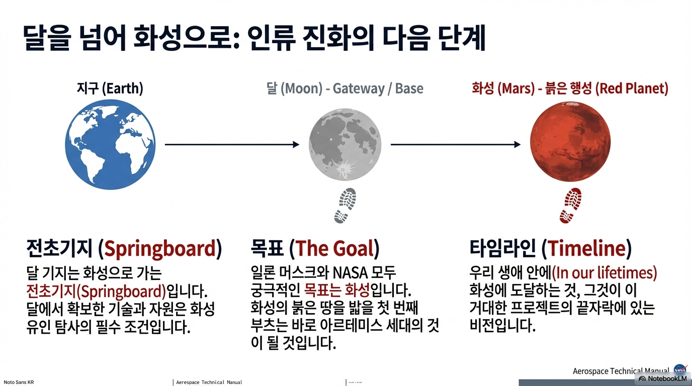 이는 대중의 인식을 "우리는 그곳에 가봤다"에서 "우리는 그곳에 있다"로 전환하는 것을 의미합니다. 달에 영구적인 기지를 건설하고, 이를 발판 삼아 궁극적으로 화성으로 나아가는 지속적인 인류의 존재를 암시하는 것입니다.