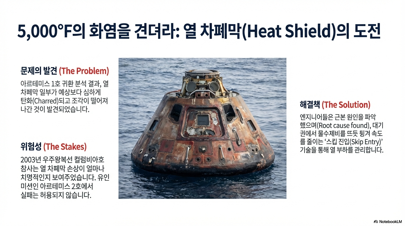 방열판은 섭씨 2,760도에 달하는 재진입 시의 엄청난 열로부터 우주비행사를 보호하는 유일한 장치입니다. 2003년 우주왕복선 컬럼비아호가 방열판 손상으로 공중 분해되었던 비극을 생각하면 이는 간과할 수 없는 치명적인 결함입니다. 이 문제를 해결해야 하는 엔지니어들의 압박감은 상상을 초월합니다.