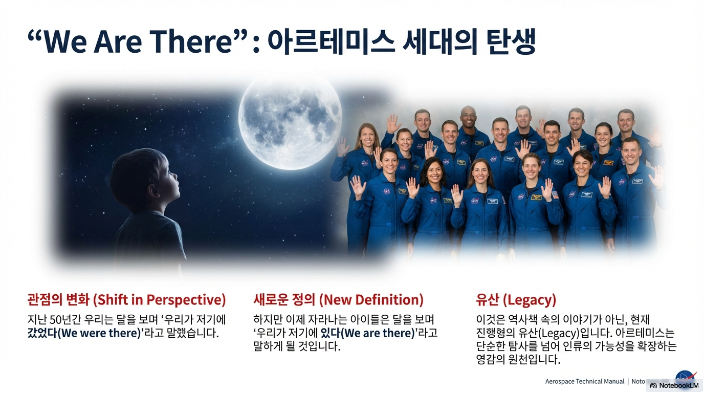 아폴로 시대는 달을 '역사의 일부'로 만들었습니다. 기성세대에게 달은 "우리가 가봤던 곳"이라는 과거의 유산입니다. 하지만 아르테미스는 새로운 비전을 제시합니다.
