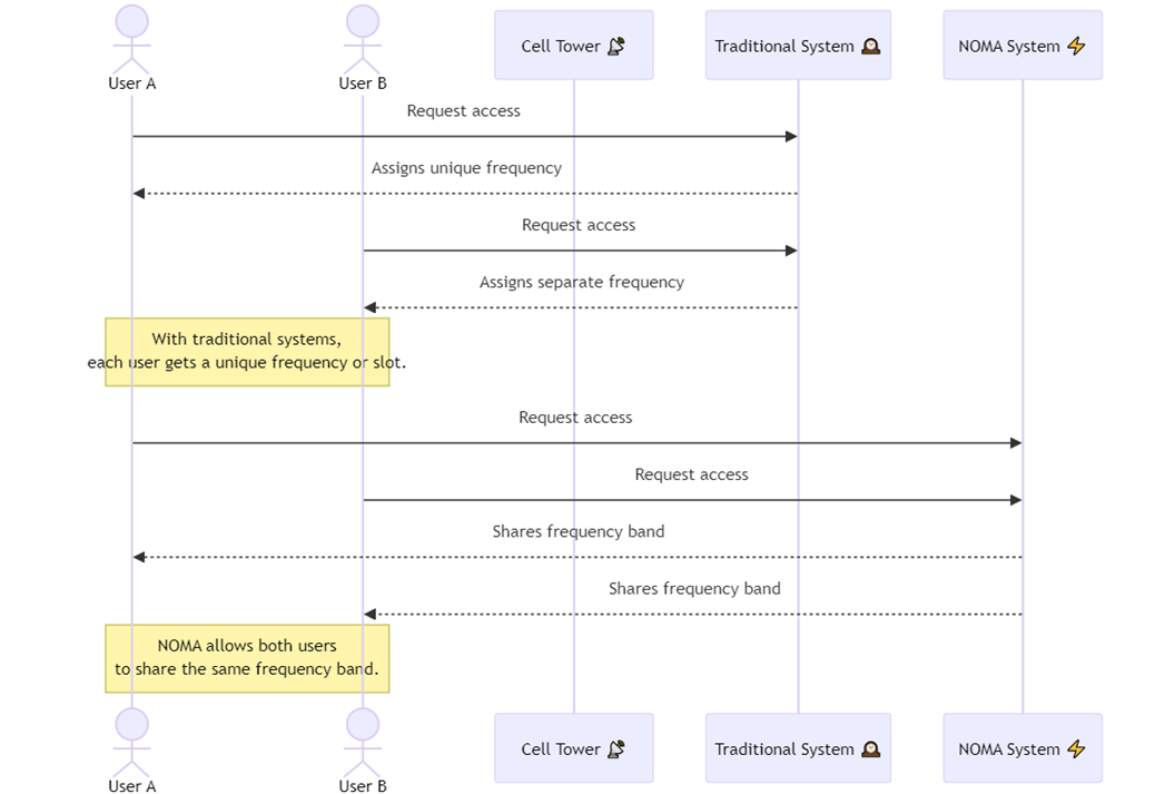 기존 시스템에서는 간섭을 피하기 위해 각 사용자에게 서로 다른 주파수 대역이나 시간 슬롯을 할당했습니다. 이 방식은 동시 수용 가능한 사용자 수에 제한이 있습니다.