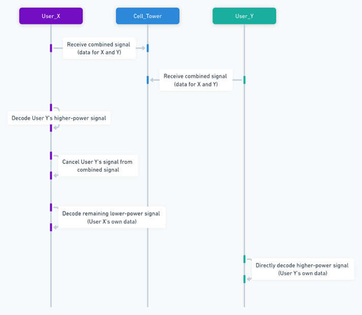 User A는 먼저 User B의 고전력 신호를 디코딩한 후 제거하고, 자기 신호를 디코딩합니다. 이를 통해 동일한 자원을 사용하면서도 간섭 없이 다수의 사용자가 통신할 수 있어, 스펙트럼 효율성이 크게 향상됩니다.