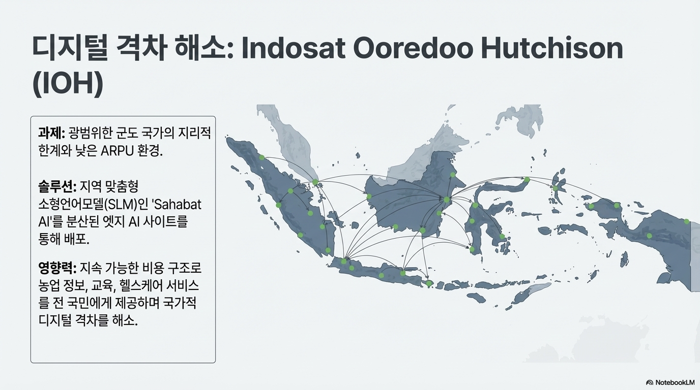 - 사회적 AI 모델 (인도네시아 IOH): 저비용 구조를 통해 농업, 교육, 의료 서비스를 제공하며 디지털 격차를 해소하고 있습니다. 이는 저수익(Low-ARPU) 지역에서도 AI가 어떻게 사회적 가치와 경제적 효율성을 동시에 달성할 수 있는지 보여주는 모델입니다.