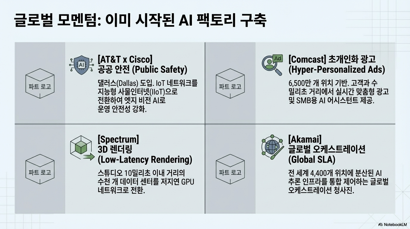 - 10ms의 혁신 (Comcast & Spectrum): 컴캐스트는 고객과 단 몇 밀리초(ms) 거리에 있는 엣지 망을 통해 초개인화된 광고 서비스를 제공합니다. 스펙트럼(Spectrum) 역시 스튜디오에서 10ms 미만의 지연 시간으로 3D 렌더링 협업이 가능한 GPU 네트워크를 구축하여 미디어 산업의 구조를 바꾸고 있습니다.
