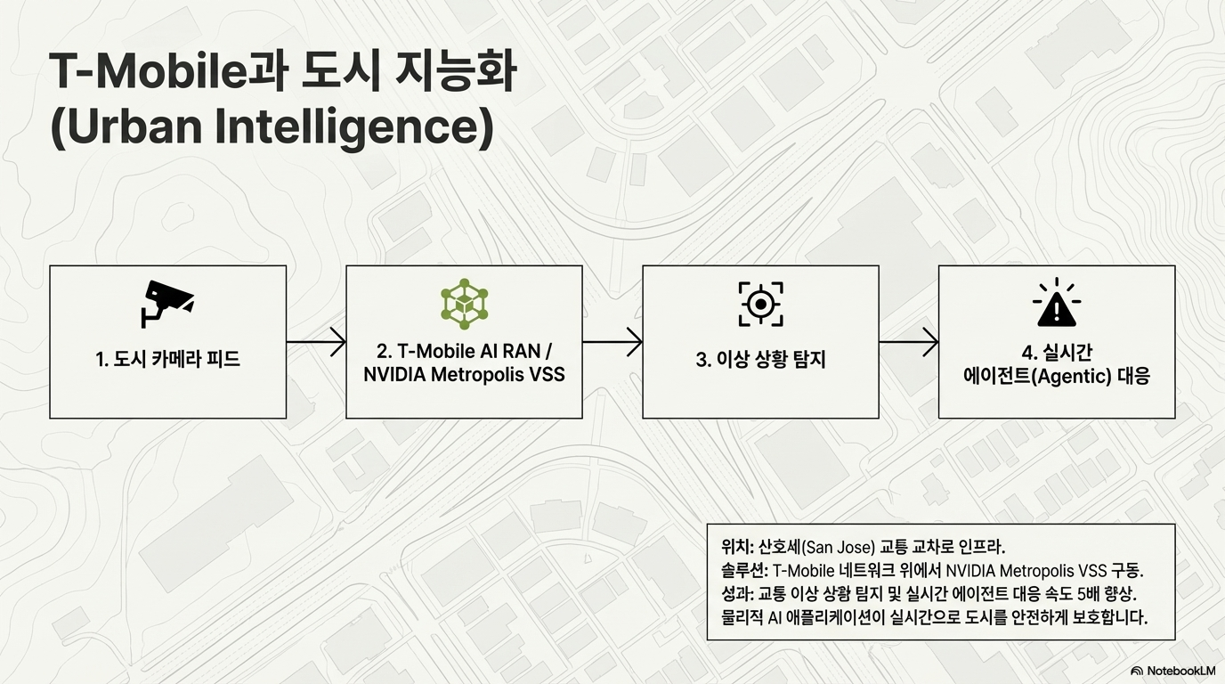 - 실증된 성능(T-Mobile 사례): T-Mobile은 산호세 시에서 NVIDIA Metropolis와 VSS(Video Search Summarization) 버전 3 청사진을 활용하여 교통 안전 분석을 실시했습니다. 그 결과, 교통 이상 상황 감지 속도가 기존 대비 5배 향상되는 혁신적인 성과를 거두었습니다.