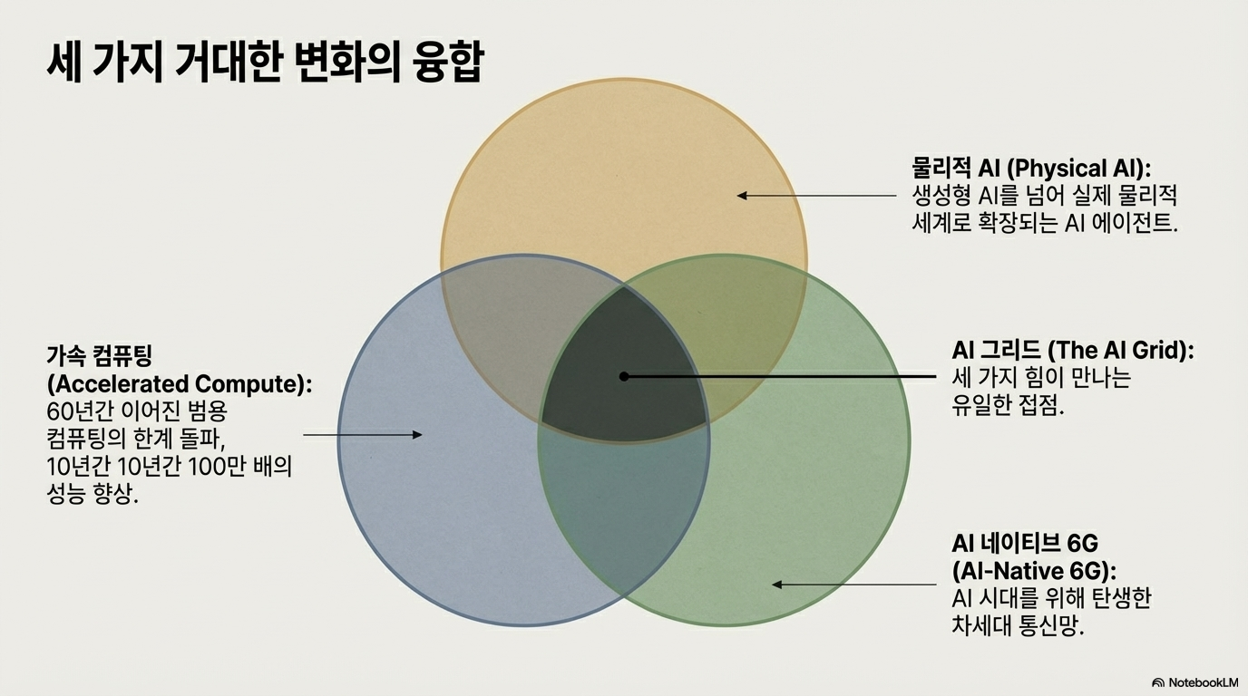 지난 60년간 인류의 디지털 문명을 지탱해 온 일반 컴퓨팅 아키텍처가 종말을 고하고, '가속 컴퓨팅(Accelerated Computing)'이라는 거대한 파도가 밀려오고 있습니다. 지난 10년간 성능이 무려 100만 배 향상된 이 기술적 변곡점은 단순히 IT 산업의 변화에 그치지 않습니다. 젠슨 황 NVIDIA CEO는 "AI가 컴퓨팅을 재정의하며 인류 역사상 최대 규모의 인프라 구축을 이끌고 있다"고 강조하며, 그 다음 혁명의 중심은 바로 '통신(Telecommunications)'임을 명시했습니다.