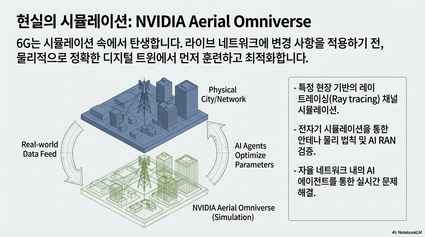 - 디지털 트윈에서의 탄생: 6G는 실제 망을 구축하기 전, NVIDIA Aerial Omniverse 디지털 트윈 환경에서 먼저 태어납니다. 물리적으로 정확한 시뮬레이션을 통해 빔포밍 전략과 새로운 파형(Waveform)을 검증함으로써 구축 리스크를 최소화합니다.
