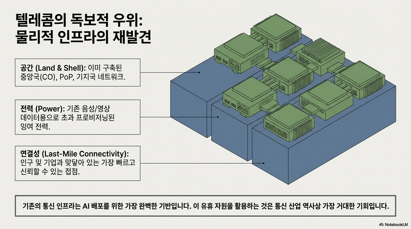 전 세계 통신사들은 AI 혁명을 위한 가장 강력한 자산을 이미 손에 쥐고 있습니다. 바로 전국에 촘촘히 퍼져 있는 **토지(Land), 전력(Power), 그리고 물리적 거점(Shell)**입니다. 특히 주목해야 할 지점은 기존의 통신 인프라가 음성, 영상, 데이터를 위해 **'초과 설계(Overprovisioned)'**되어 있다는 사실입니다.