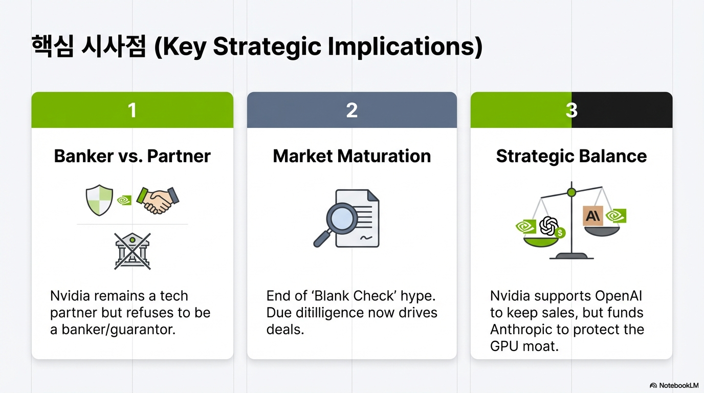 결국 기존의 거대 인프라 구축 계획을 보류하고 새로운 지분 투자로 방향을 선회하는 한편, 경쟁사인 앤스로픽에도 거액을 베팅하는 이 아슬아슬한 줄타기는 AI 패권 전쟁 시대의 생존을 위한 Nvidia의 치밀한 계산인 셈입니다. 이번 사태는 우리에게 중요한 질문을 던집니다. 미래 AI 산업의 파트너십은 과연 어떤 모습으로 진화하게 될까요?