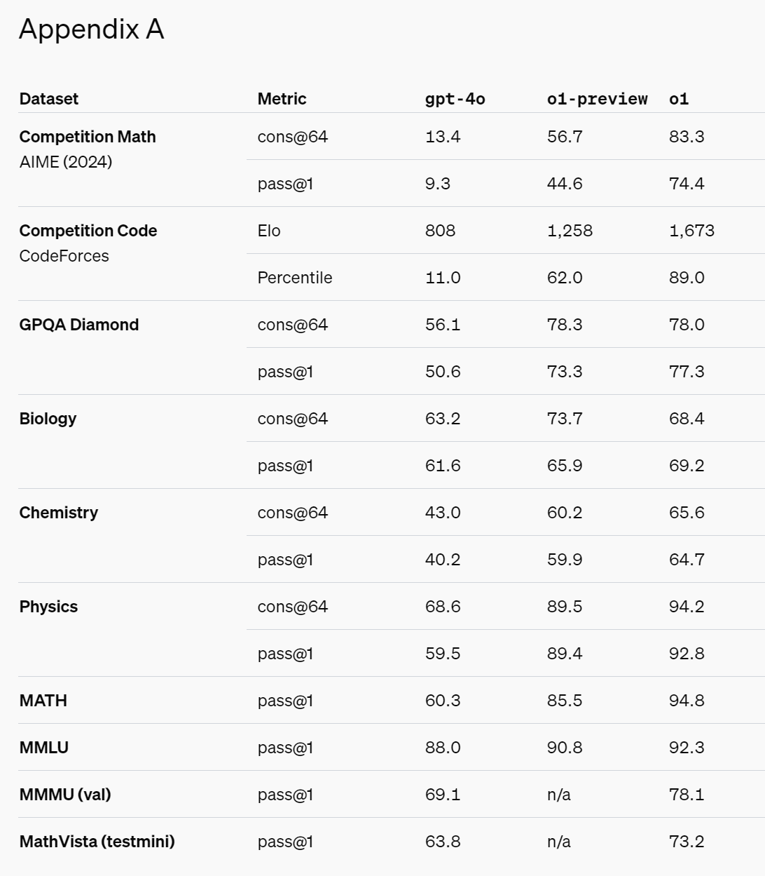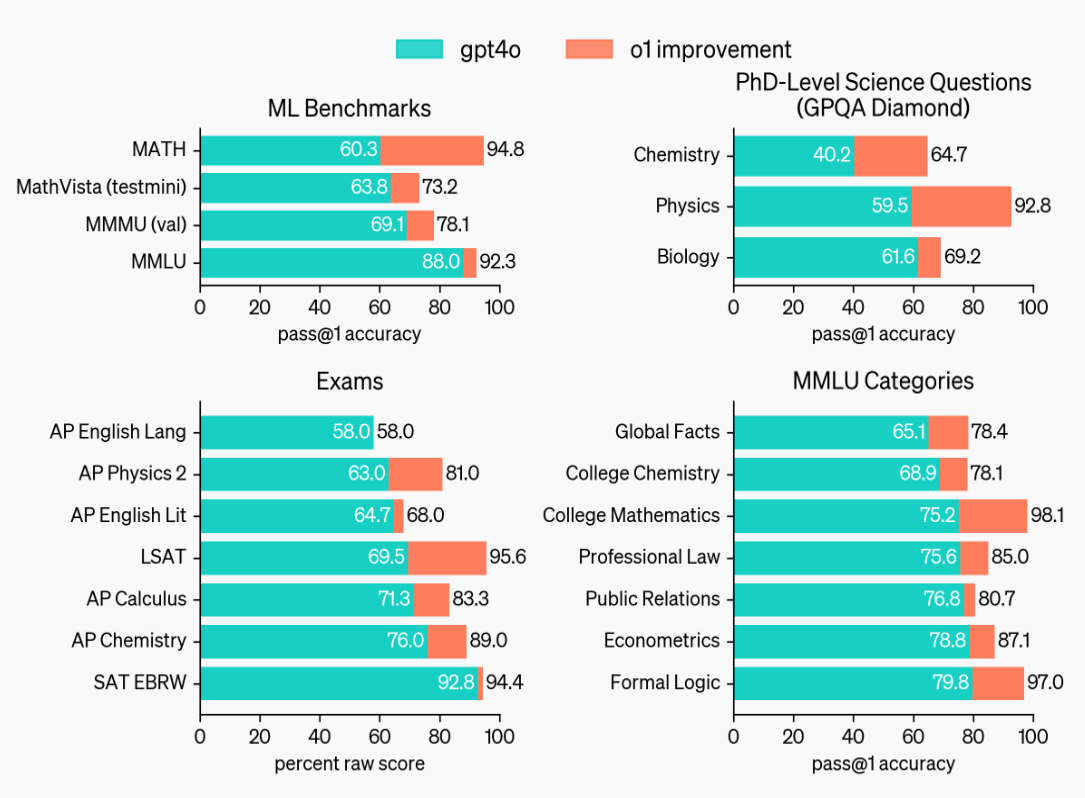 그 결과 o1이 이러한 인간 전문가들의 성능을 뛰어넘어 이 벤치마크에서 처음으로 인간을 능가한 모델이 되었습니다. 이러한 결과는 o1이 모든 면에서 박사보다 더 뛰어나다는 것을 의미하는 것은 아니며, 단지 일부 문제에서 o1이 박사 수준의 전문가가 해결할 수 있는 문제를 더 잘 해결할 수 있음을 나타냅니다. 다른 여러 기계 학습 벤치마크에서도 o1은 최신 모델을 능가했습니다. 시각적 인식 기능이 활성화된 o1은 MMMU에서 78.2%의 점수를 기록하여 인간 전문가와 경쟁할 수 있는 최초의 모델이 되었습니다. 또한 MMLU의 57개 하위 범주 중 54개에서 GPT-4o보다 더 우수한 성능을 보였습니다.