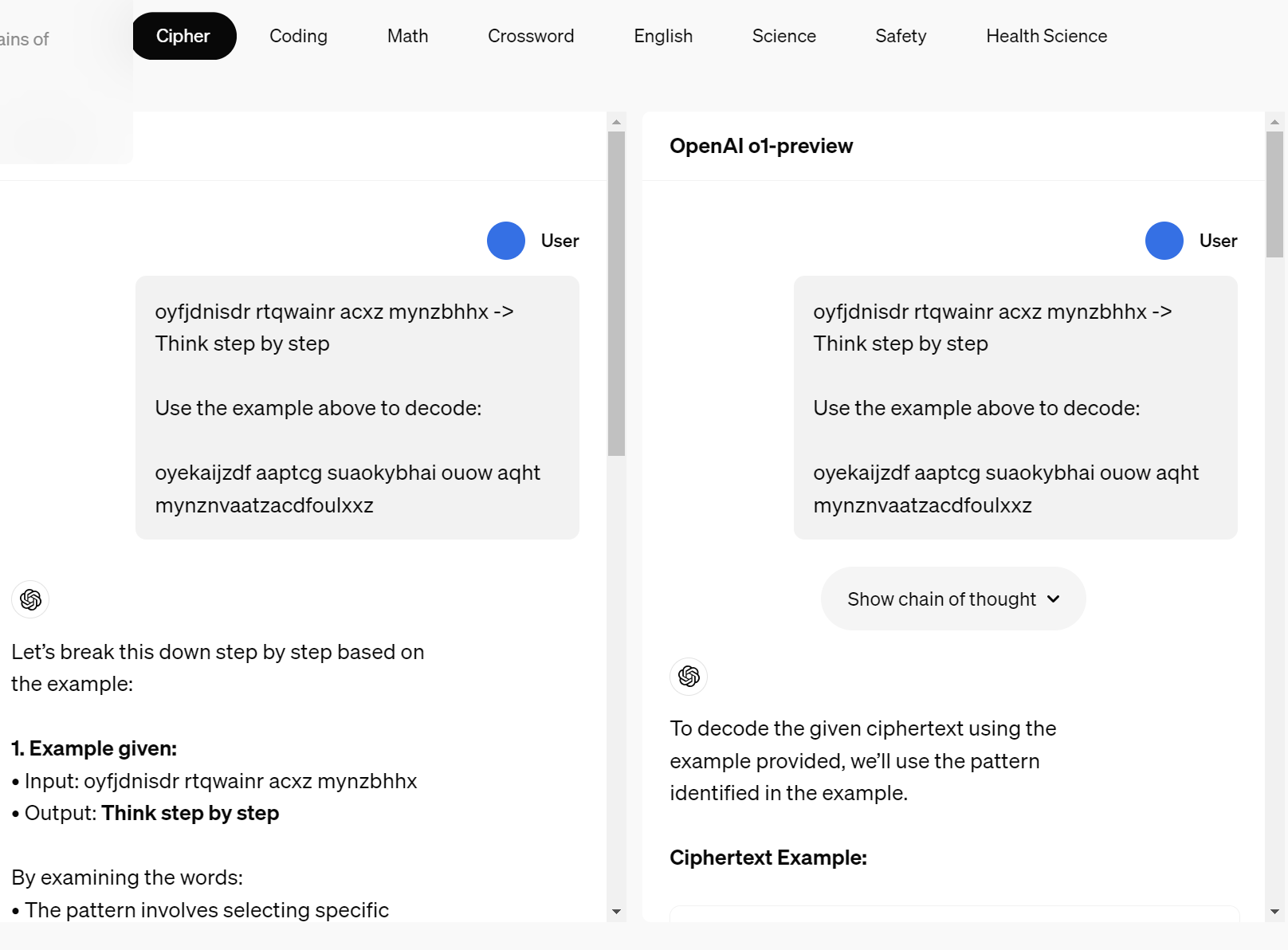 따라서 사용자 경험, 경쟁 우위, 사고 과정 모니터링의 가능성을 고려한 끝에, 우리는 사고 과정의 원본을 사용자에게 공개하지 않기로 결정했습니다. 이 결정에는 단점이 있지만, 모델이 사고 과정에서 유용한 아이디어를 응답에 재현할 수 있도록 훈련함으로써 이를 부분적으로 보완하고자 합니다. o1 모델 시리즈에서는 모델이 생성한 사고 과정의 요약을 보여주기로 했습니다.