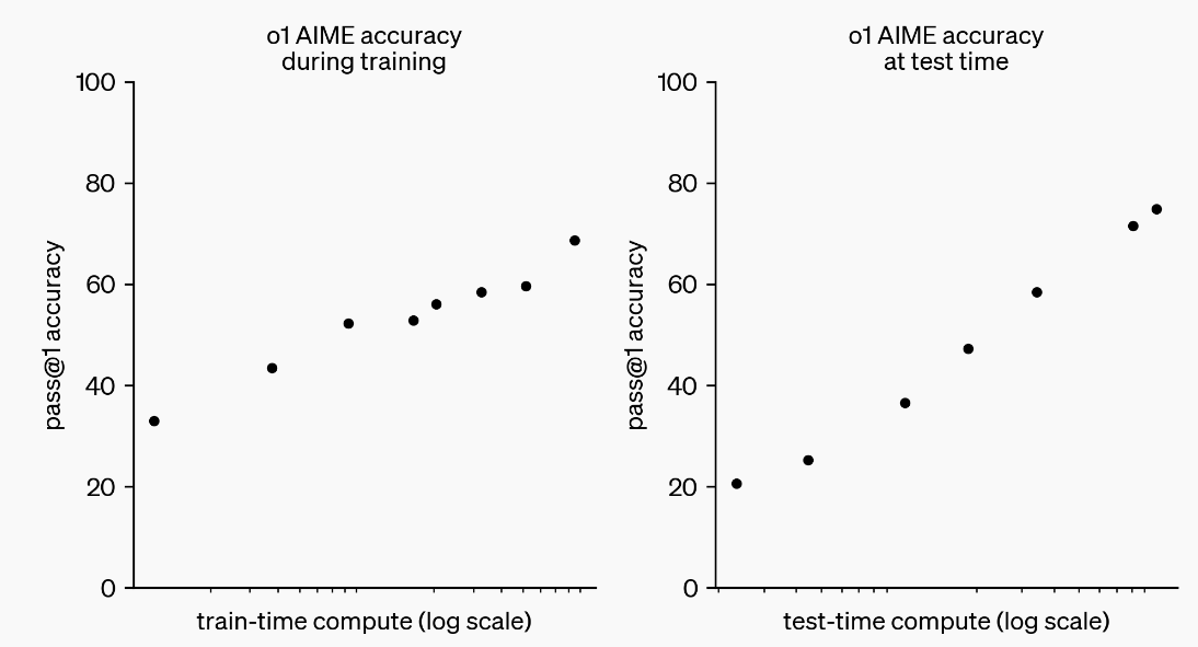 우리의 대규모 강화 학습 알고리즘은 모델이 자신의 사고 과정을 사용하여 생산적으로 생각하는 법을 가르치며, 매우 데이터 효율적인 훈련 과정을 통해 이루어집니다. o1의 성능은 더 많은 강화 학습(훈련 시간 계산)과 더 많은 사고 시간(테스트 시간 계산)을 투자할수록 꾸준히 개선되는 것으로 나타났습니다. 이 접근 방식을 확장하는 데 필요한 제약은 LLM 사전 훈련과 상당히 다르며, 우리는 이를 계속 조사하고 있습니다.