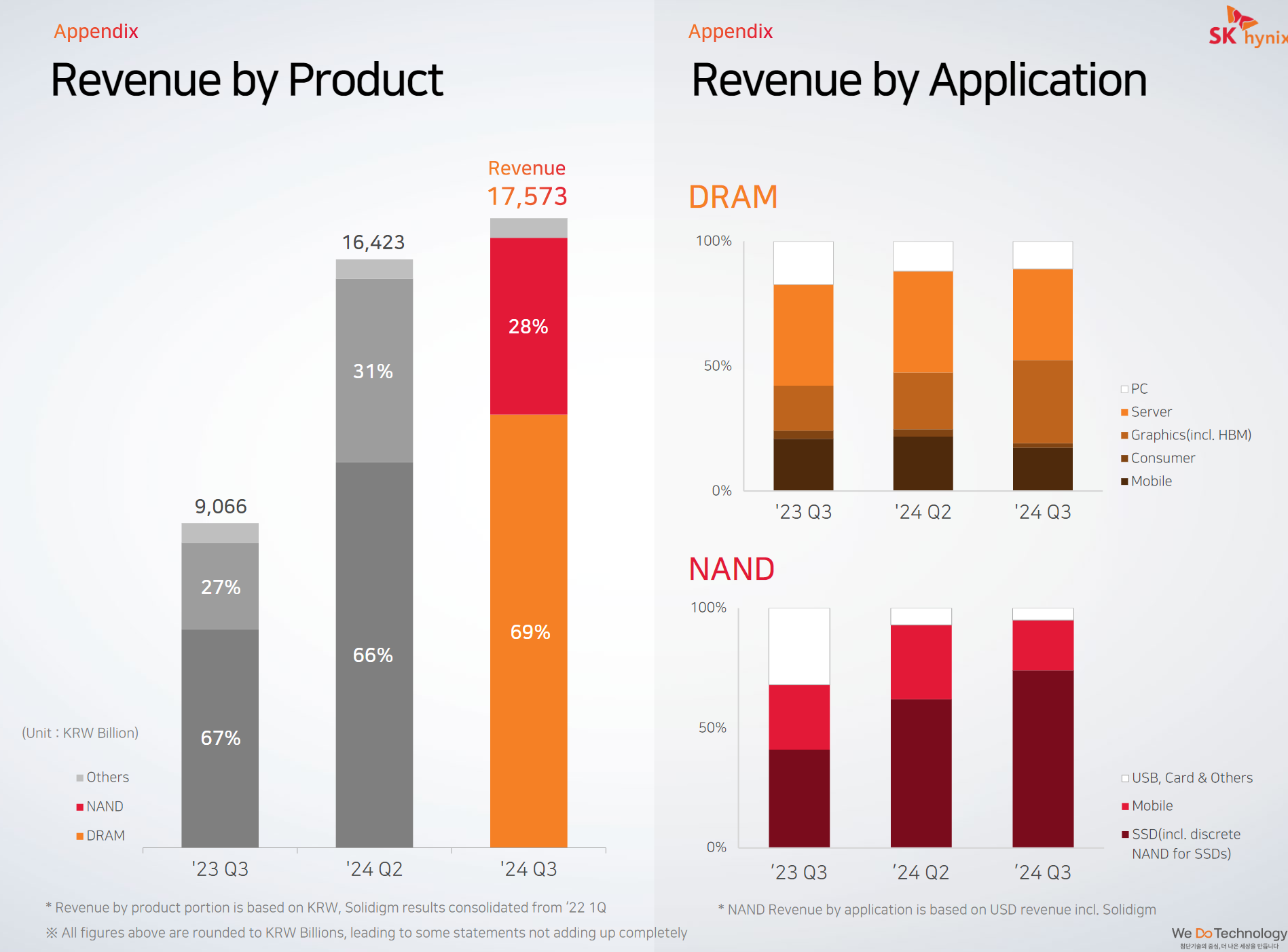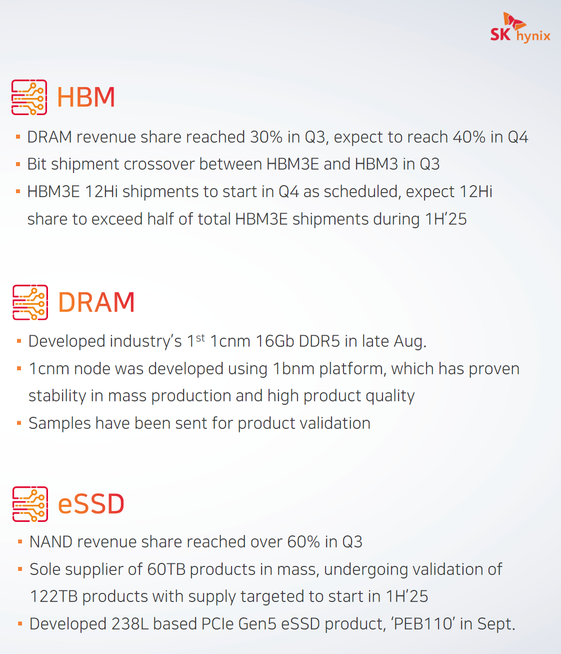 - DRAM 매출은 전체 매출에서 30% 비중을 차지했으며, 4분기에는 이 비중이 **40%**까지 증가할 것으로 예상됩니다. 특히 HBM3E 제품의 출하가 3분기 중 HBM3를 초과했으며, 4분기에는 HBM3E 12단 제품의 출하가 본격화될 예정입니다.
