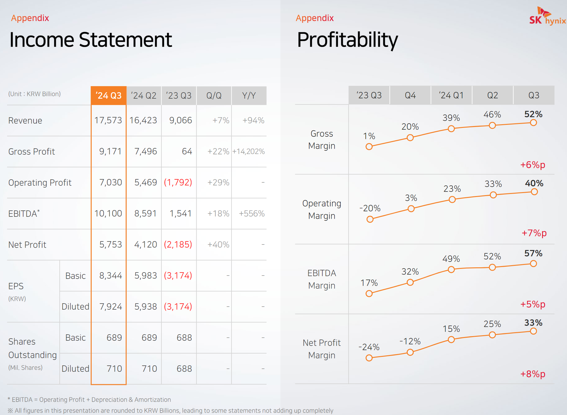 2024년 3분기 SK 하이닉스의 총 매출은 17.57조원으로 전 분기 대비 7% 증가, 전년 동기 대비 94% 증가하였습니다. 특히, **HBM(High Bandwidth Memory)**과 eSSD(Enterprise Solid State Drive) 등의 고부가가치 제품 판매가 두드러졌으며, DRAM과 NAND 메모리의 전반적인 수익성 개선이 돋보였습니다.