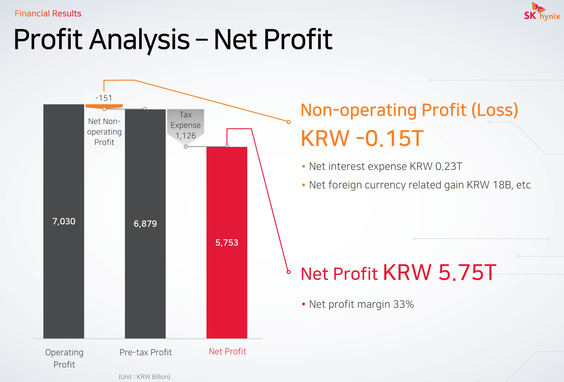 - 영업 외 손익은 -0.15조원으로, 순이자비용과 외환 관련 손익을 포함한 일부 비영업 항목에서 발생한 손실입니다. 그러나 이러한 영업 외 손익 손실은 SK 하이닉스의 본질적인 수익성에 큰 영향을 미치지 않았습니다.