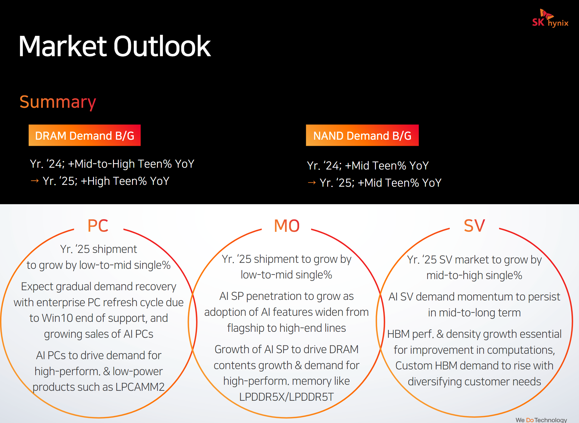 - 또한, 이번 매출 성장은 글로벌 메모리 수요의 회복과 맞물려 이루어졌습니다. 특히, AI와 데이터센터 산업의 지속적인 성장세가 HBM 및 DRAM 제품의 수요 증가로 이어졌으며, Win10 지원 종료에 따른 PC 교체 수요도 기업용 PC 시장에서 점진적인 수요 회복을 이끌었습니다. 이와 같은 외부 요인들이 SK 하이닉스의 매출 성장에 긍정적인 영향을 미쳤습니다.