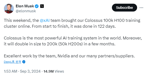 | 엘론 머스크의 최신 슈퍼컴퓨터 ‘콜로서스 (Colossus)’와 AI의 미래 (6) | 2024.09.11 |