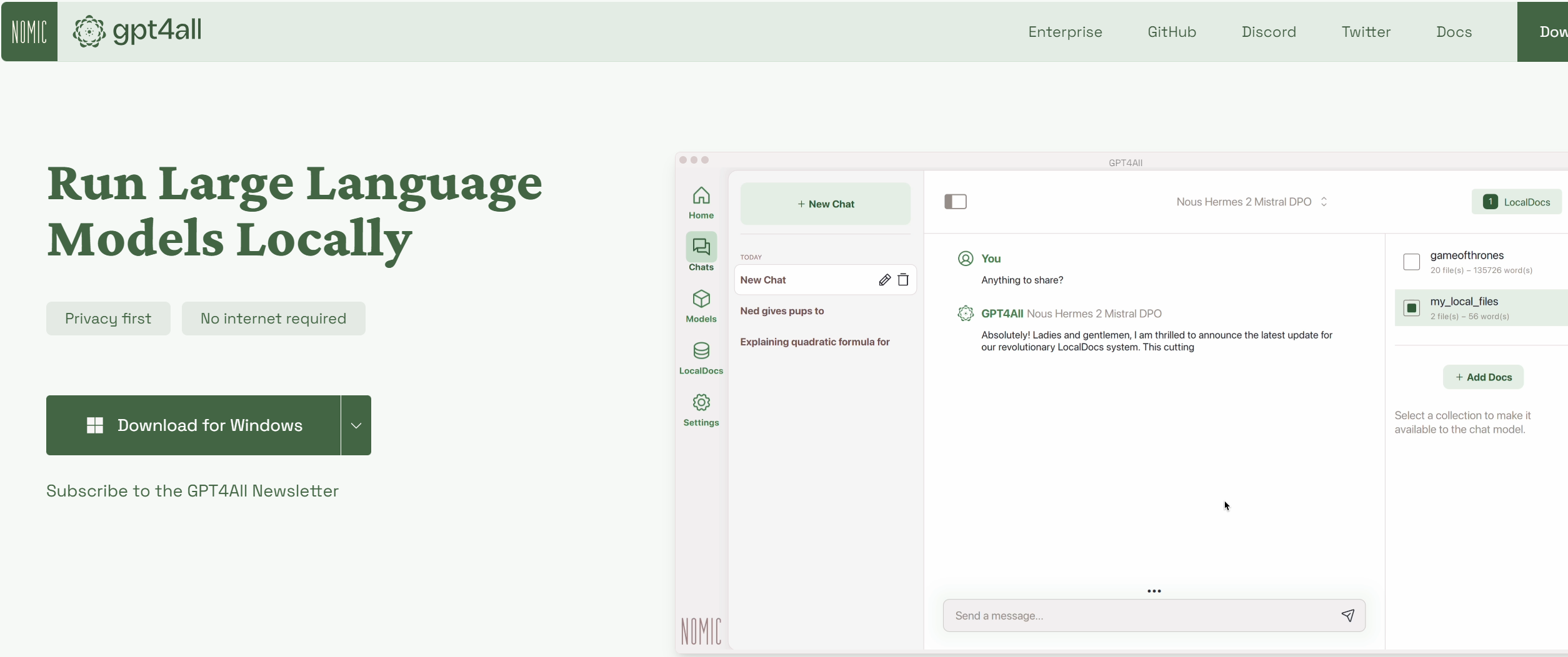 설명: GPT4All은 오픈소스 기반의 대형 언어 모델을 제공하는 플랫폼으로, 다양한 응용 프로그램 개발에 유용합니다. 연구 및 학습 목적으로도 많이 사용됩니다.